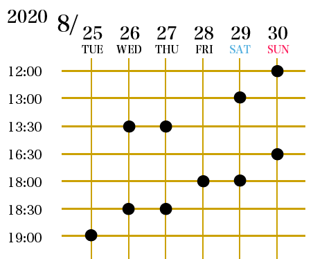| 27日(木)18:30 | 丸山和志 | 高橋風香 | 谷川功 | 堀切紫 | 岡田彩 |